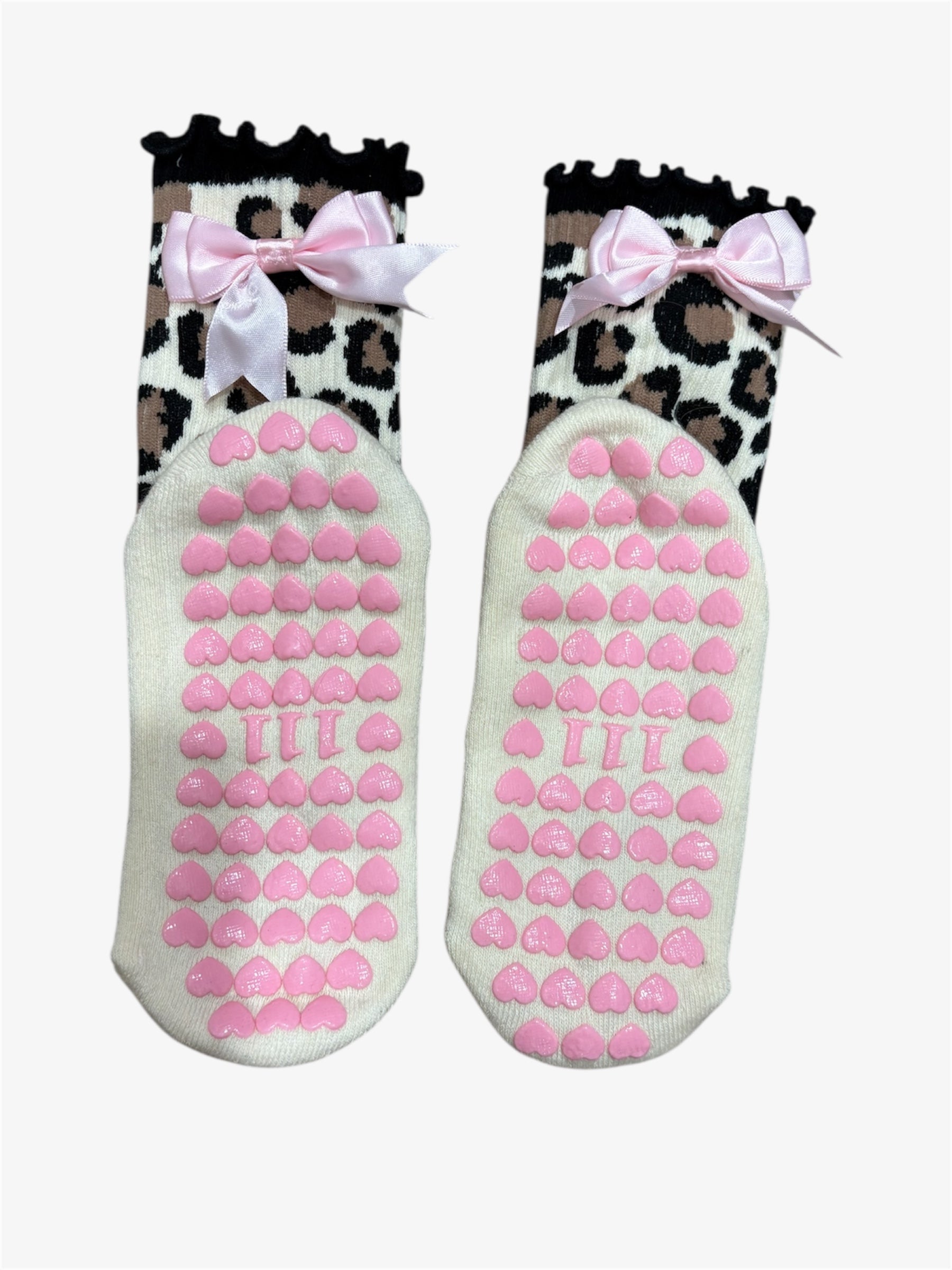 Stylish and comfy grip socks with a bold cheetah print, pink non-slip hearts at the bottom, and cute bow details. Perfect for adding fun, safety, and charm to your everyday wear.